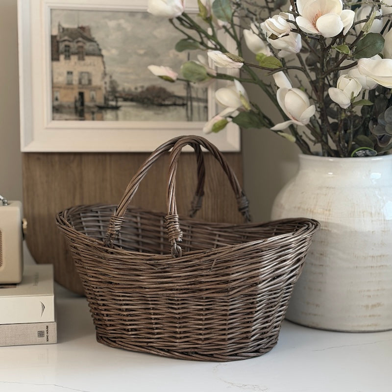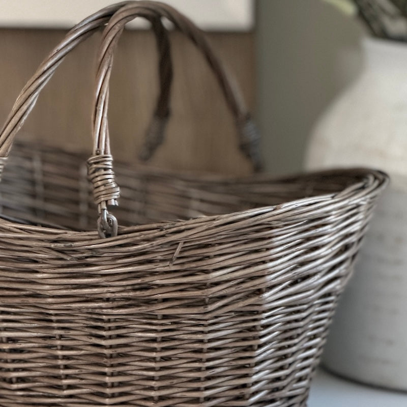 A practical woven wicker basket designed with hinged handles for easy stacking and storage. The natural finish and softly tapered shape make it suitable for open shelving, utility rooms or living spaces. Ideal for organising household items while keeping a relaxed, understated look.