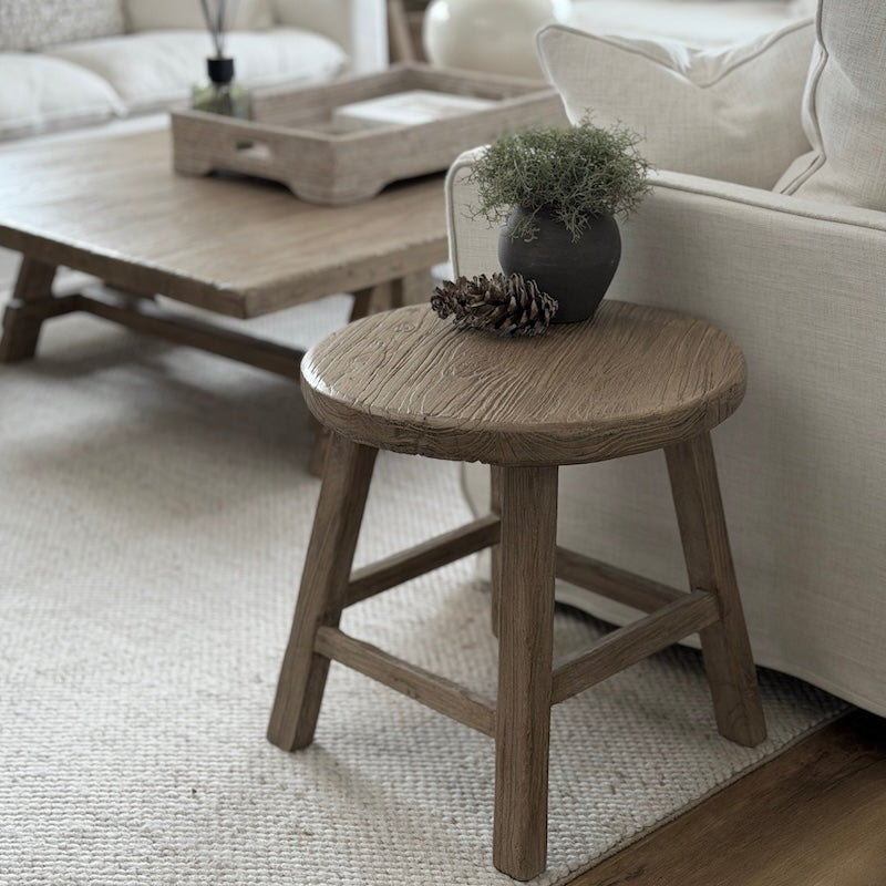 A reclaimed elm side table with beautiful natural graining and vintage character. The Antrim table brings warmth, texture and understated rustic luxury to interiors, perfect as a bedside or occasional table.