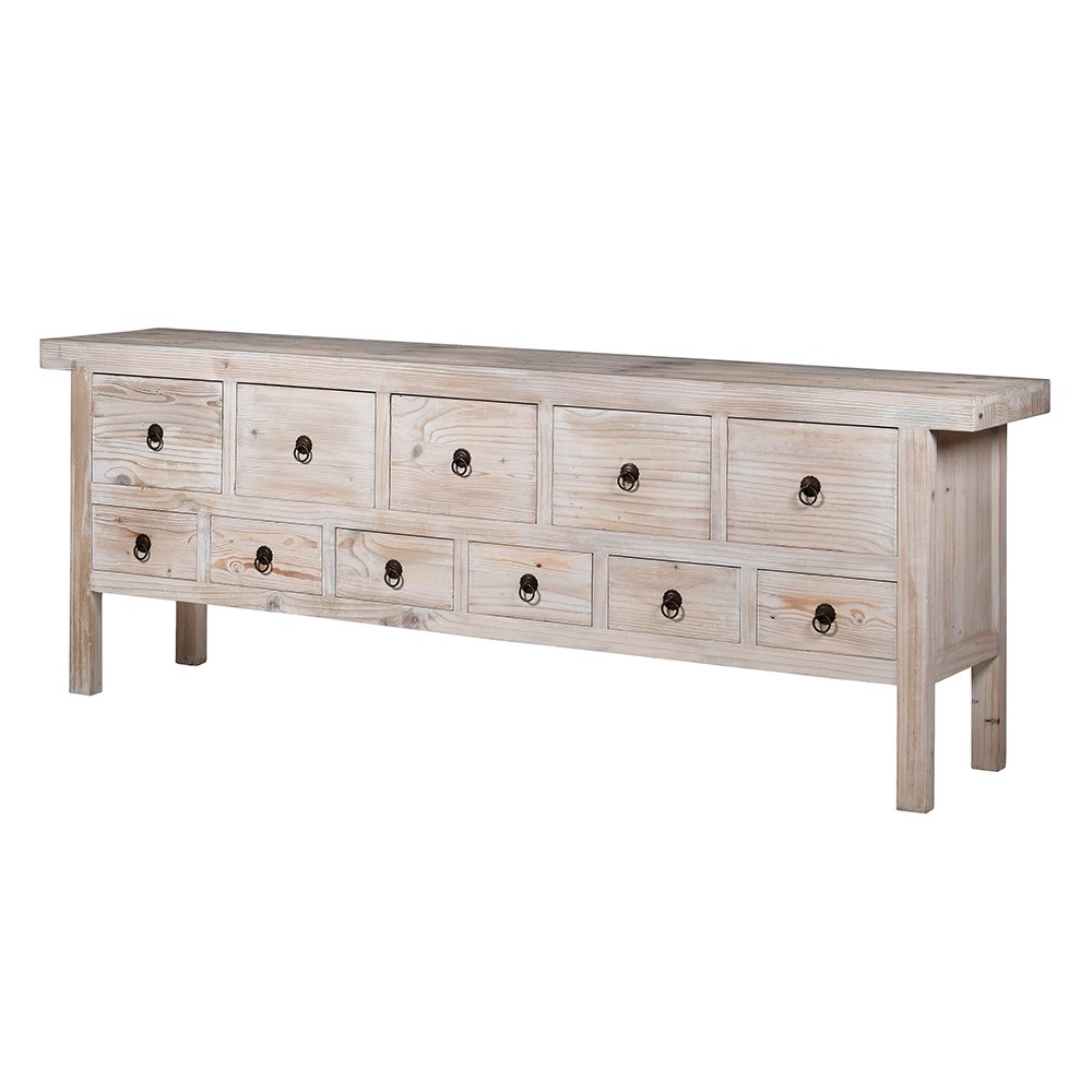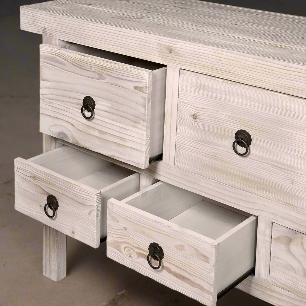 Old pine eleven drawer sideboard in a whitewashed, natural finish.