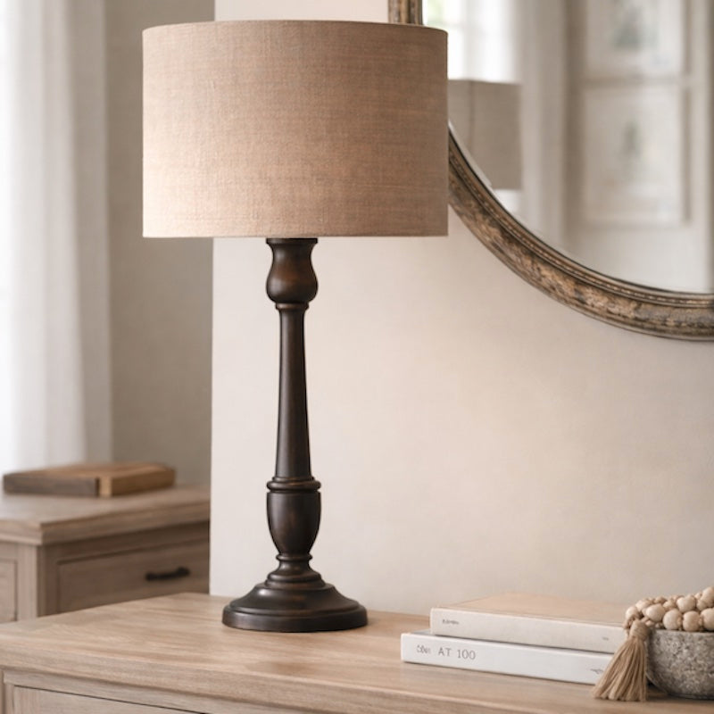 Finished in antique black, this slim mango wood turned table lamp is a stylish lamp base.