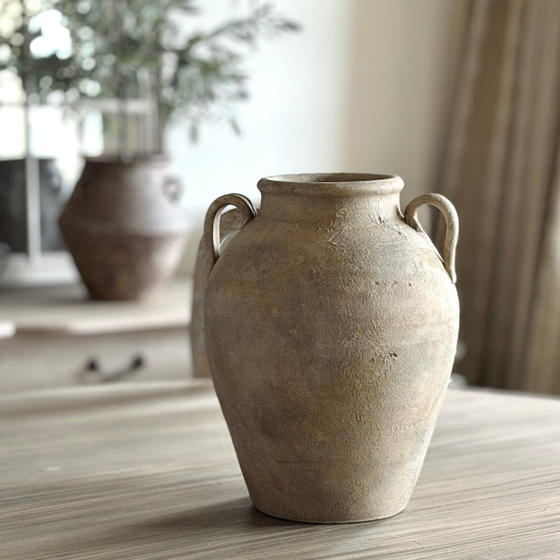 The gently weathered surface and warm earthy tones give the piece the character of an antique vessel, making it ideal for styling with dried stems or as a sculptural accent on a console, table, or shelf.