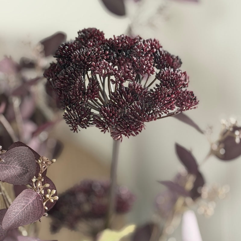 Each stem features intricate, umbrella-like seed heads in a rich mulberry plum hue, contrasted by soft green foliage.