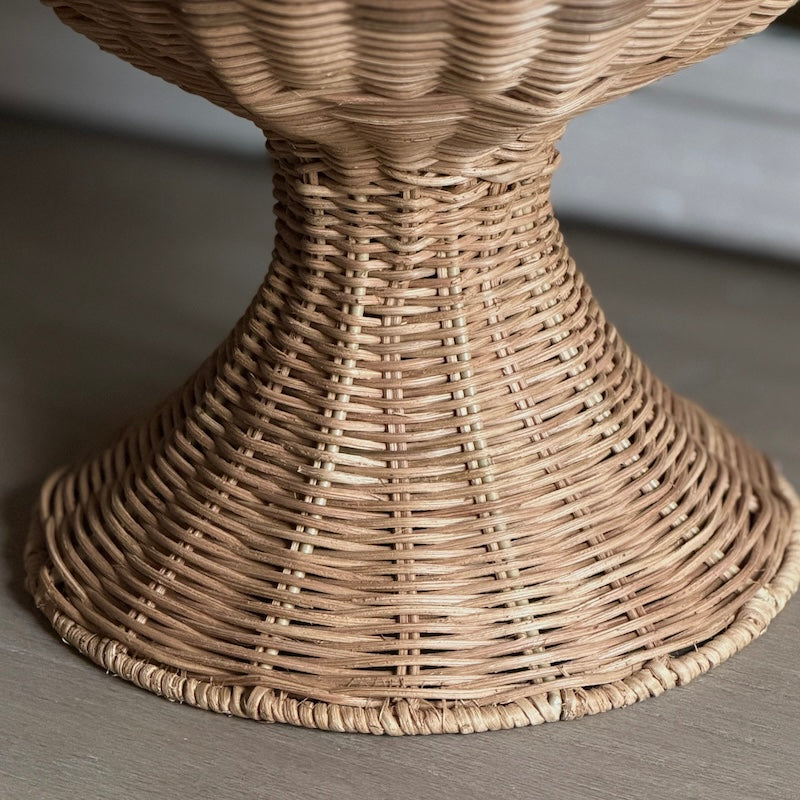A sculptural pedestal bowl handwoven from natural rattan.