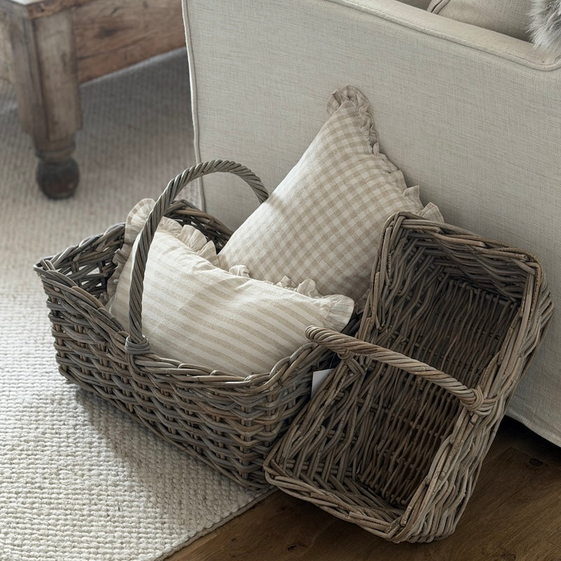 A choice of handwoven rectangular wicker baskets featuring sturdy hoop handles and a natural rustic finish.