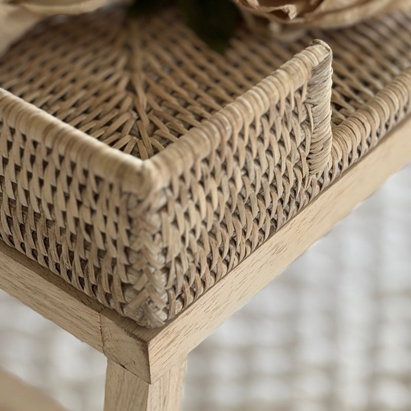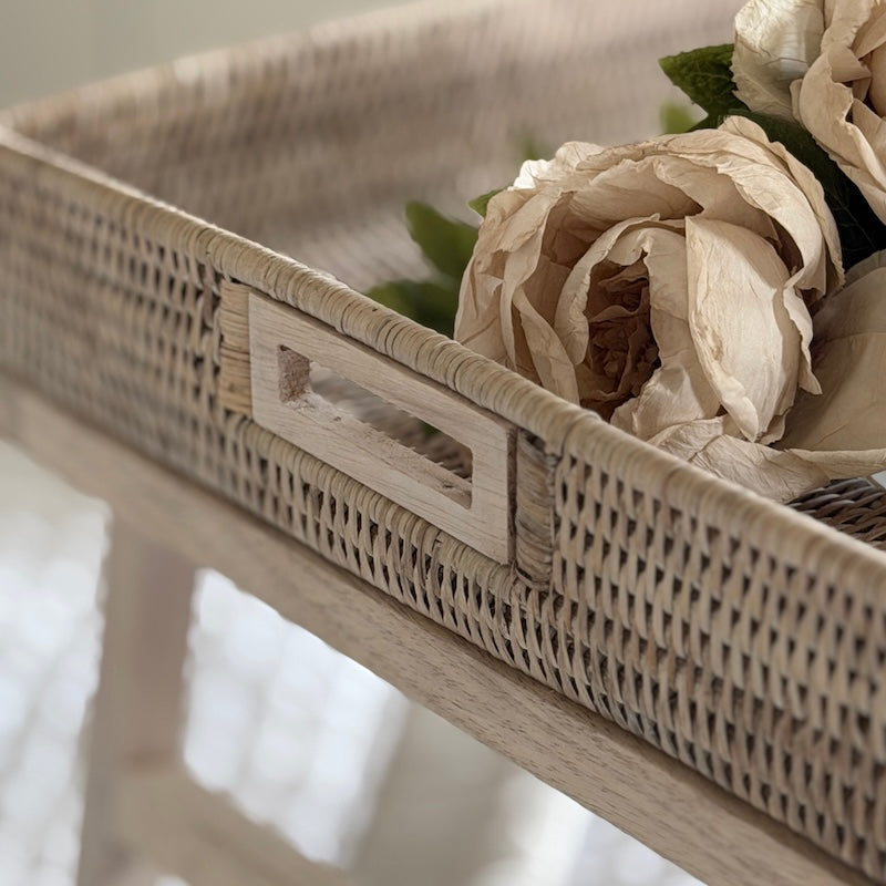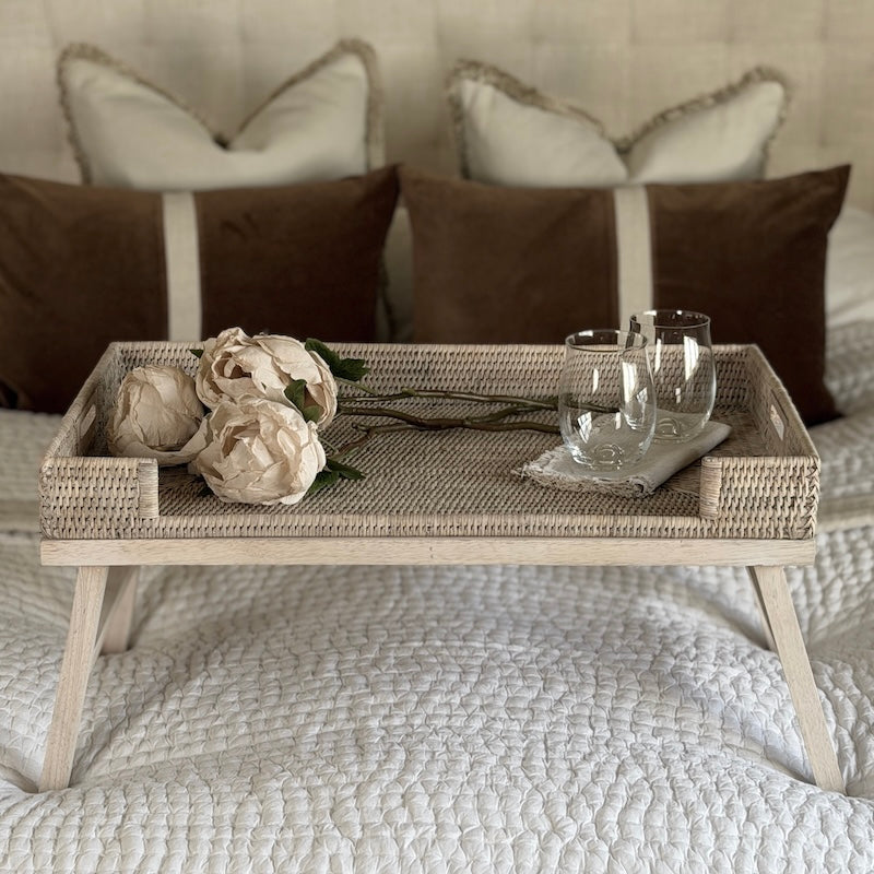 Designed for slow mornings and relaxed living, our whitewashed rattan breakfast tray brings an understated charm and effortless practicality to everyday moments. Crafted from finely woven natural rattan and set upon sturdy wooden legs, it offers a light yet refined presence — equally at home styled on a bed, sofa, or coffee table.