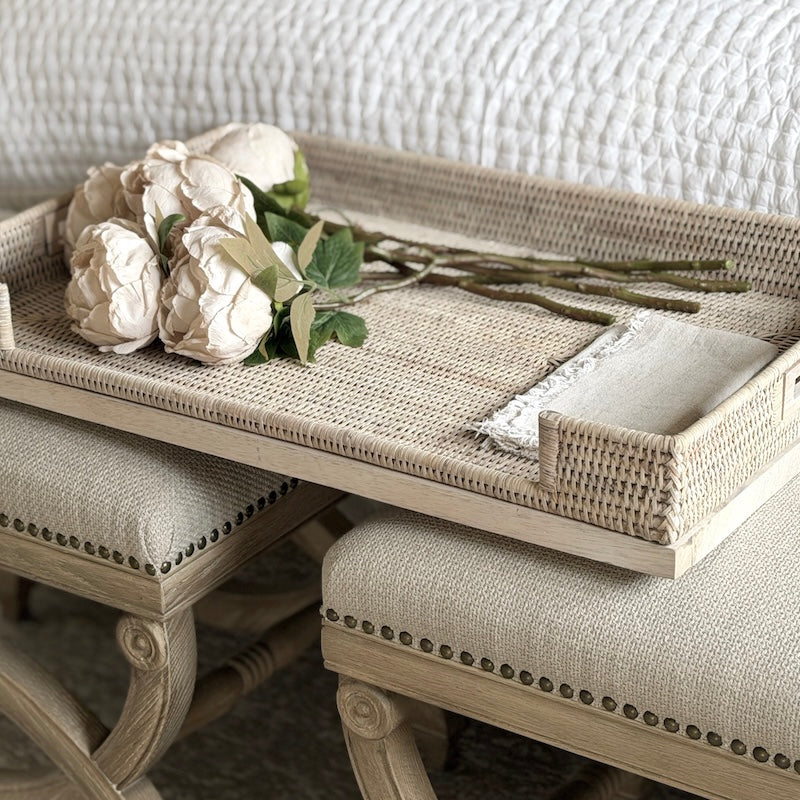 The softly weathered whitewash finish enhances the natural texture of the weave, creating a calm, neutral aesthetic that complements both coastal farmhouse and classic Cotswold interiors. Integrated side handles allow for easy carrying, while the raised edges help keep everything secure — whether serving breakfast in bed, afternoon tea, or displaying seasonal styling.
