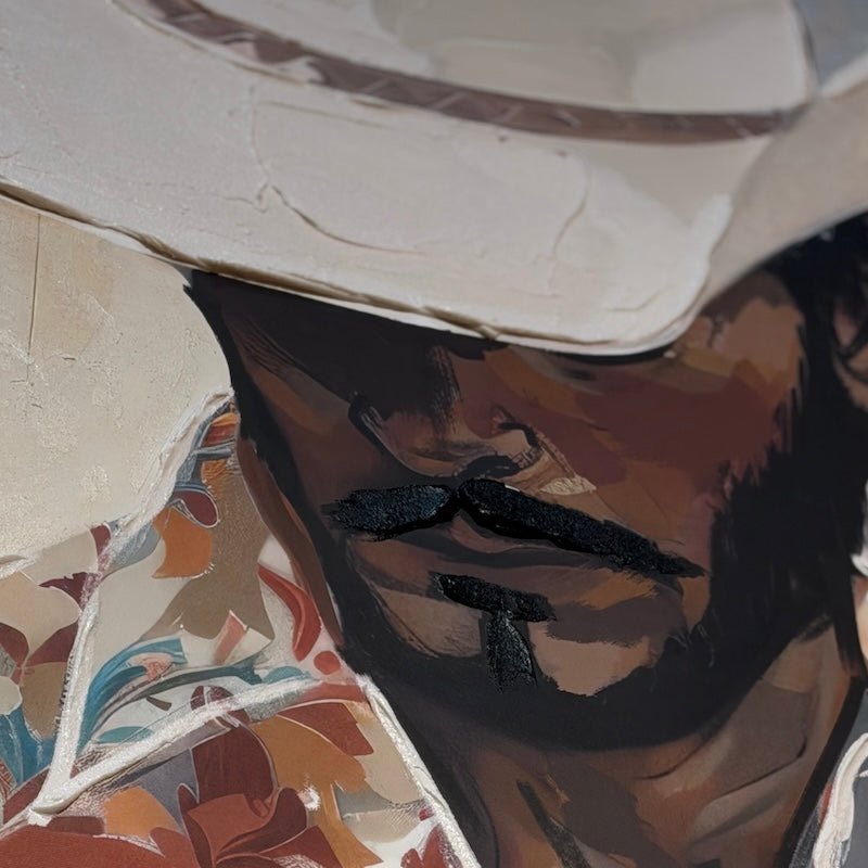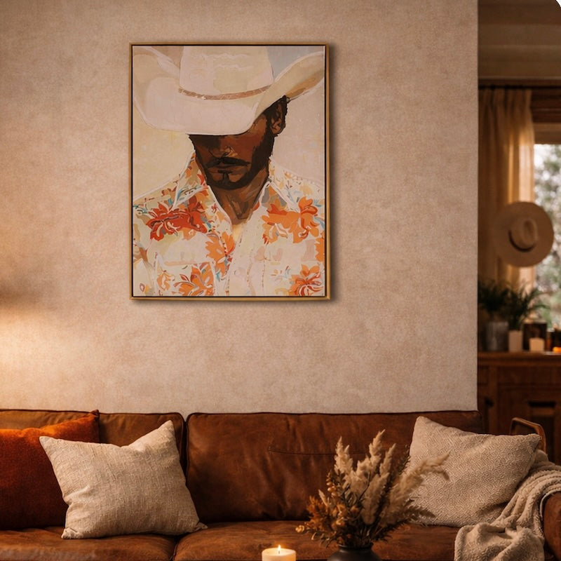 Painted in warm, expressive tones, the artwork captures a modern Western spirit — confident stance, tanned looks and a classic cowboy hat — blending contemporary portraiture with rugged Americana. It makes a powerful statement piece, perfect for adding character to living rooms, home offices or statement hallways.