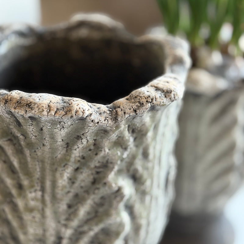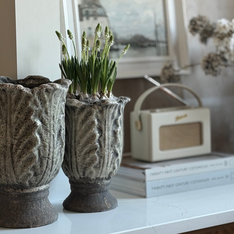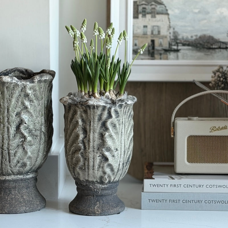 Rich in natural character, its aged grey tones and organic relief detailing create the look of an antiqued garden vessel. Perfect for bulbs, seasonal plants or dried arrangements.