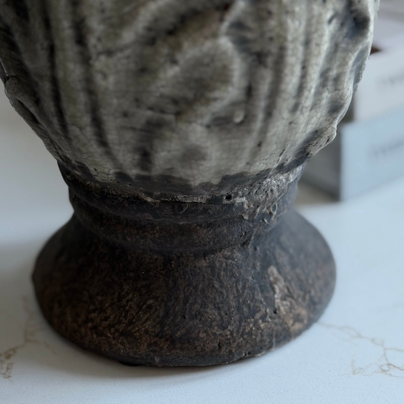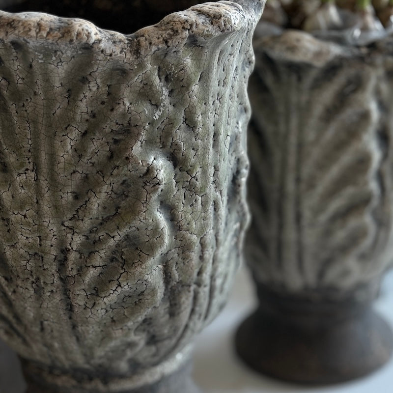 A beautifully textured pedestal planter with a softly weathered stone-effect finish and sculpted scalloped rim.