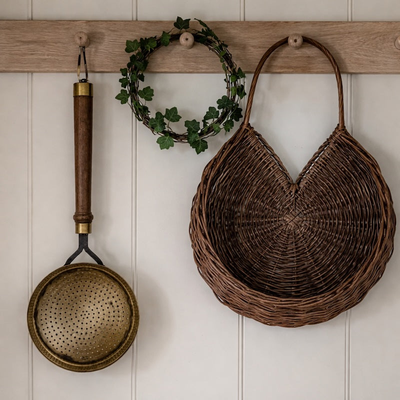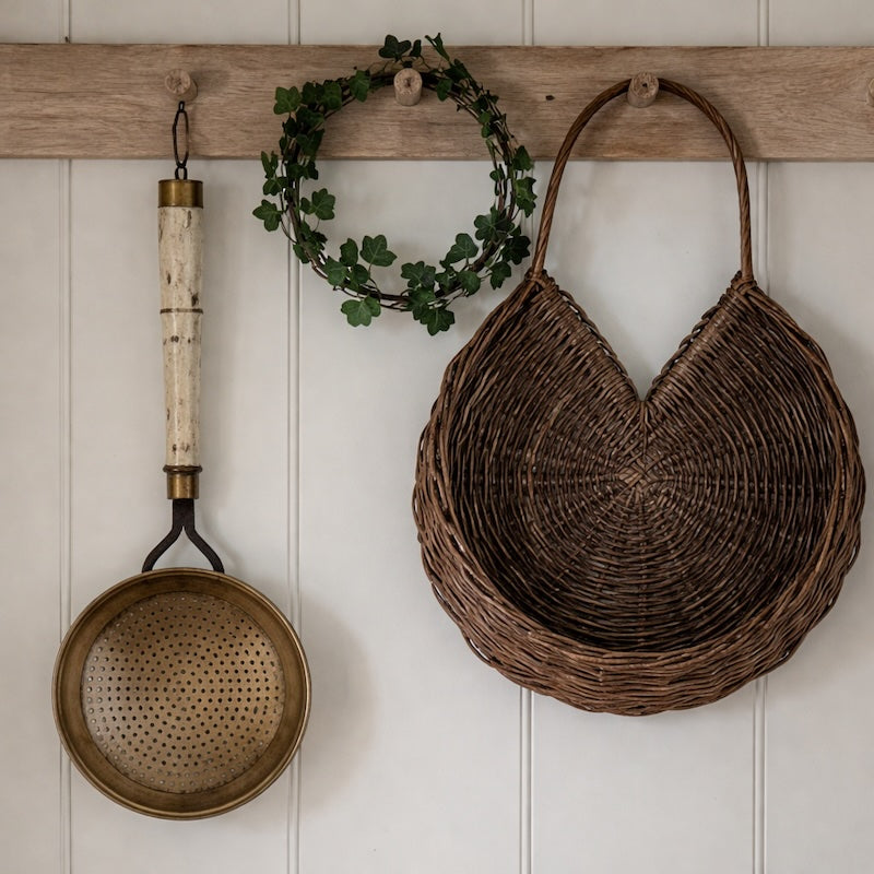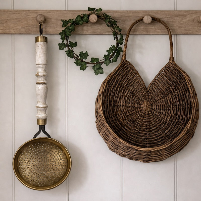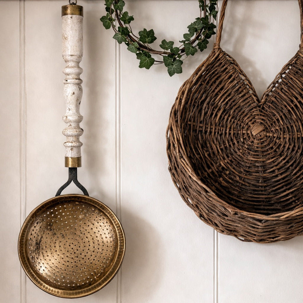 Traditionally used as a household cleaning tool, its aged brass (occasionally copper) head is pierced with a delicate dotted pattern, paired with a solid wooden handle softened by years of use.