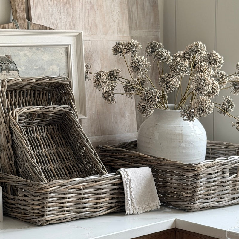 Designed with a generous shape and low profile, these trays are perfect for organising shelves, styling consoles, or serving as relaxed tabletop storage. Their textured weave and muted finish bring durable, practical and decorative organisation to everyday.