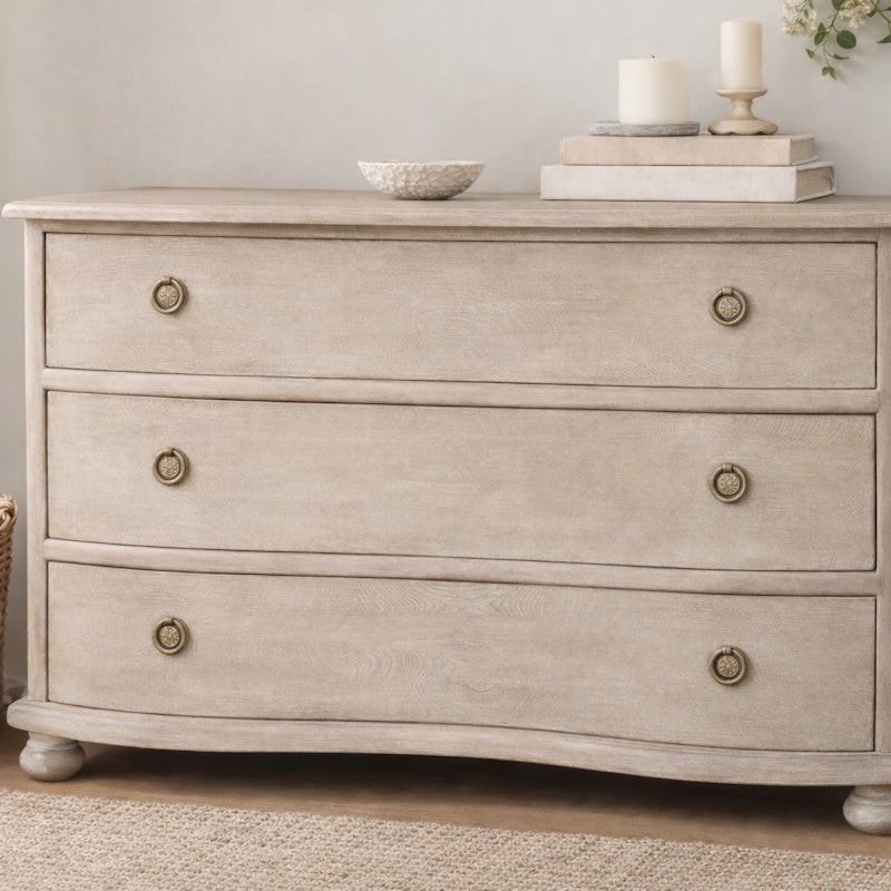 Our three-drawer serpentine chest has a gently curved frontage, while the subtle taupe-washed finish highlights the natural grain, knots and tonal variations of the timber.