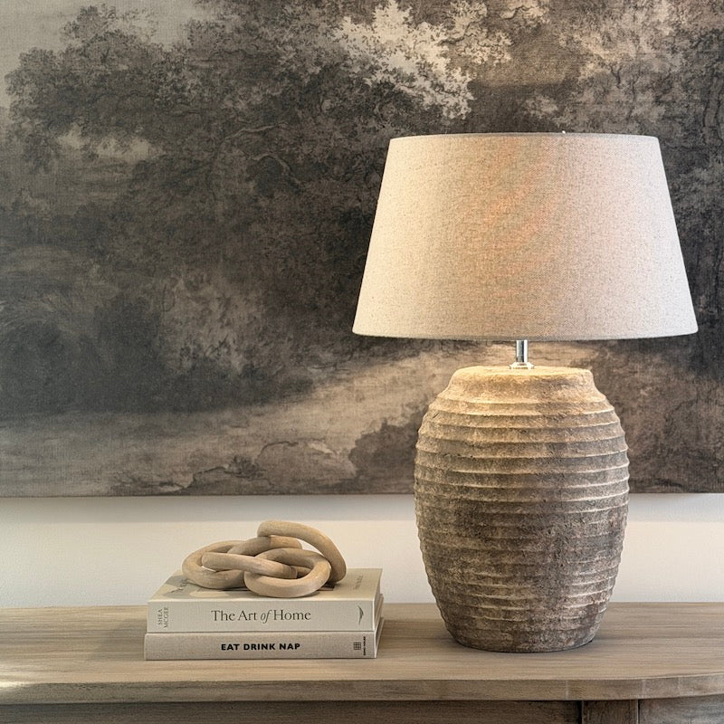Effortlessly refined, our 'exclusive' Cassaro Aged Stone Table Lamp captures the essence of rustic Cotswold luxury.