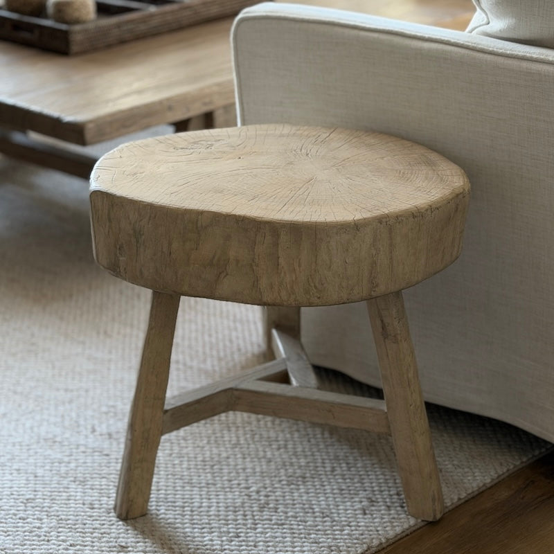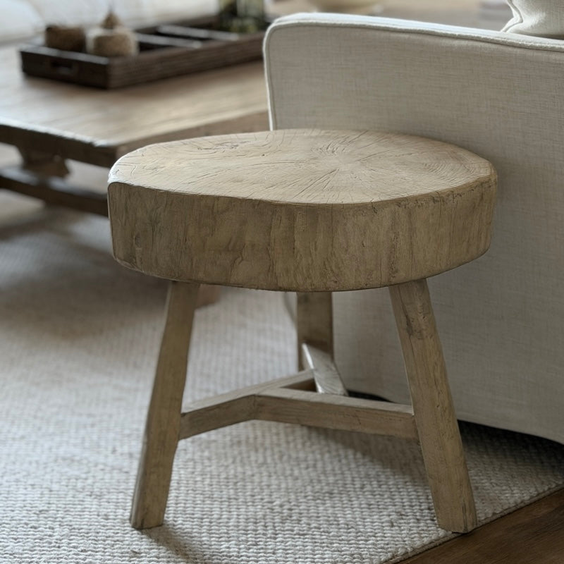Made from reclaimed wood, this large heavyweight side table blends rustic charm with timeless appeal. The size suggests it could almost be a small coffee table.
