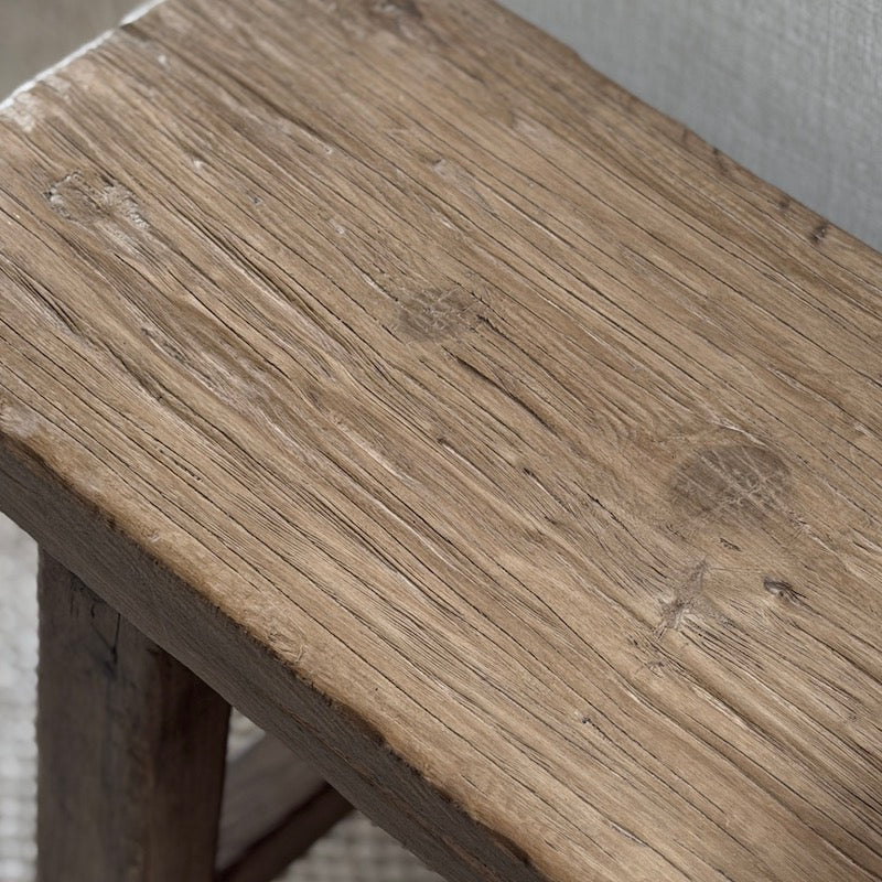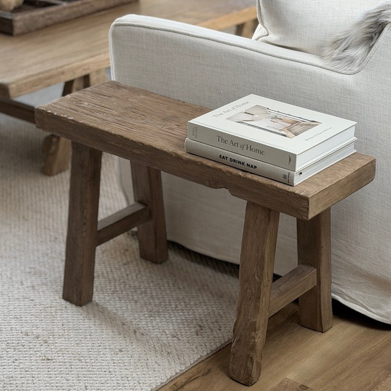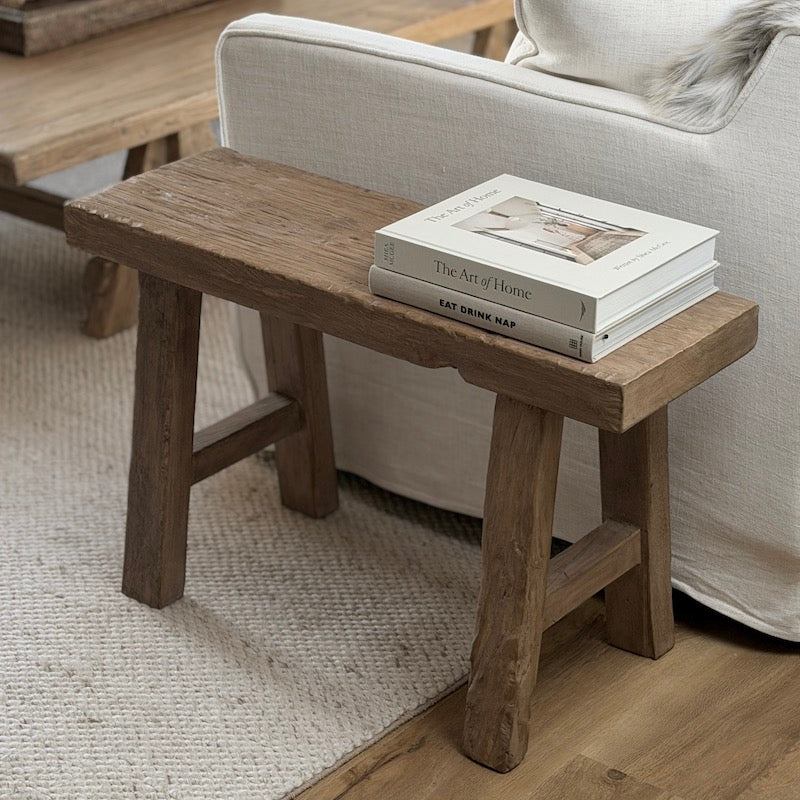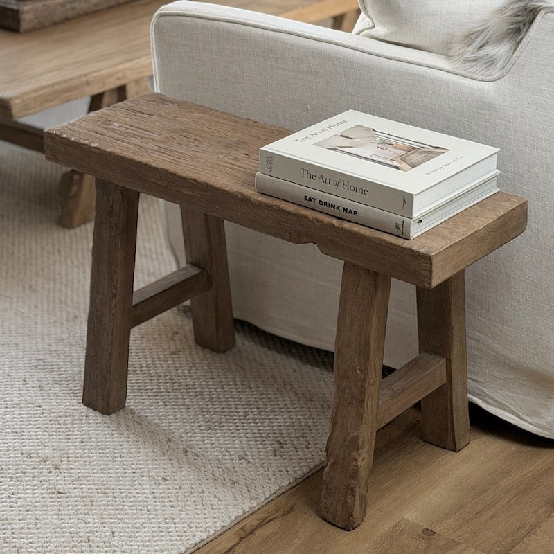 A compact rustic bench crafted from reclaimed timber, finished in a rich tone that highlights the natural grain and texture of the wood. Simple, sturdy and versatile, it’s ideal for hallways, bedrooms or as extra seating.