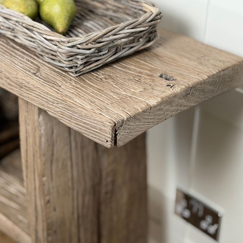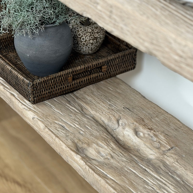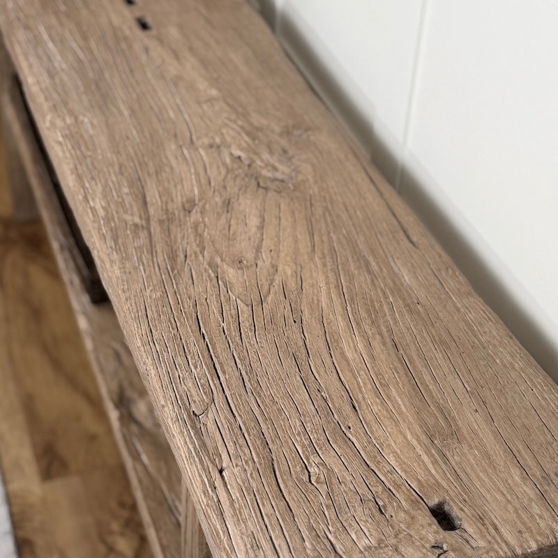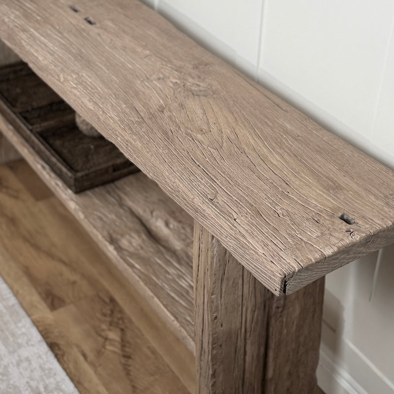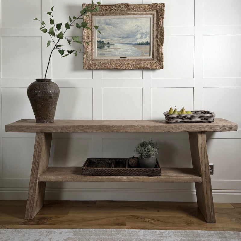 Made from aged reclaimed elm, this rustic console table brings quiet character and timeless country charm to hallways, living spaces and boot rooms alike. Each piece is defined by its softly weathered grain, natural knots and subtle imperfections — a celebration of wood with a past life.