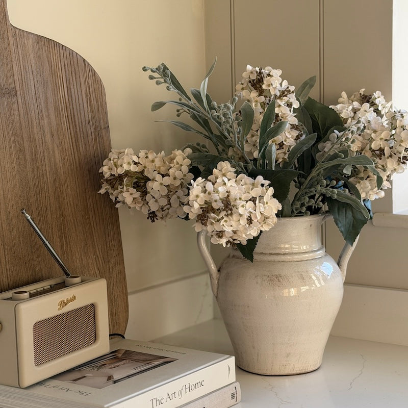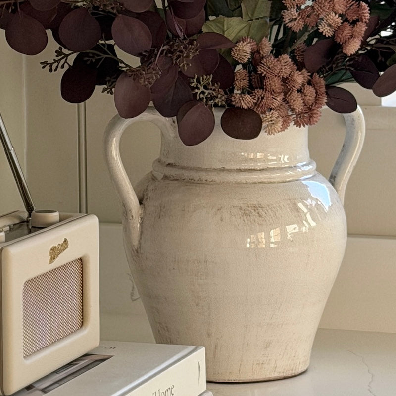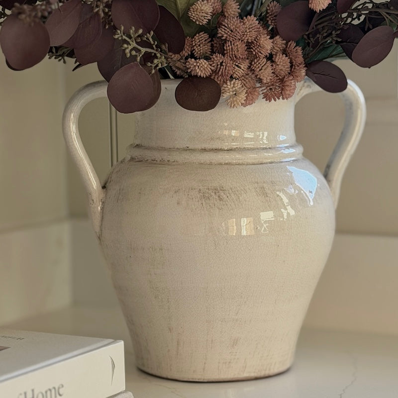 A cream ceramic vase with a gently distressed finish and classic twin handles. The glazed surface shows subtle crackling and worn detailing, giving it an aged, characterful look.