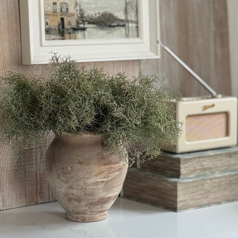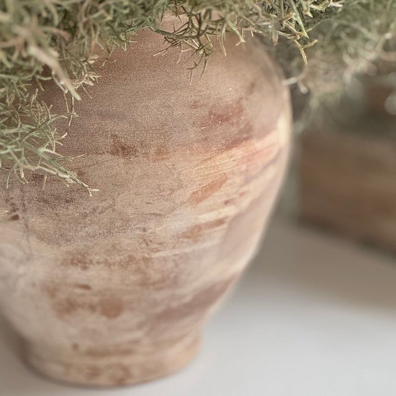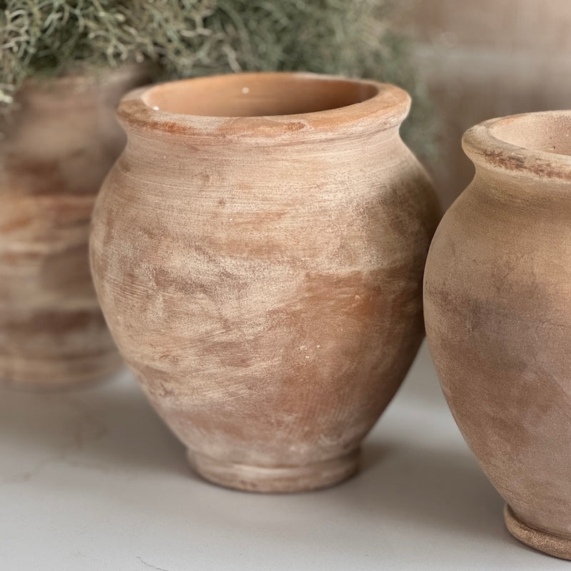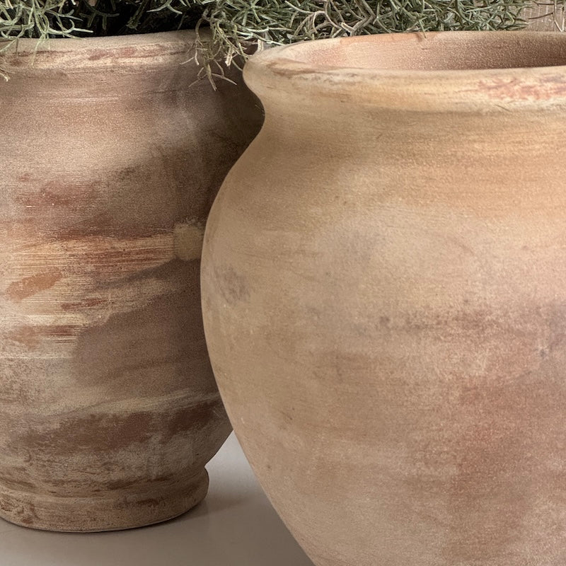 Textured earthenware vessels with natural, timeworn finishes bring depth and warmth to a softly lit corner. Layered with feathery green foliage and vintage-inspired accents