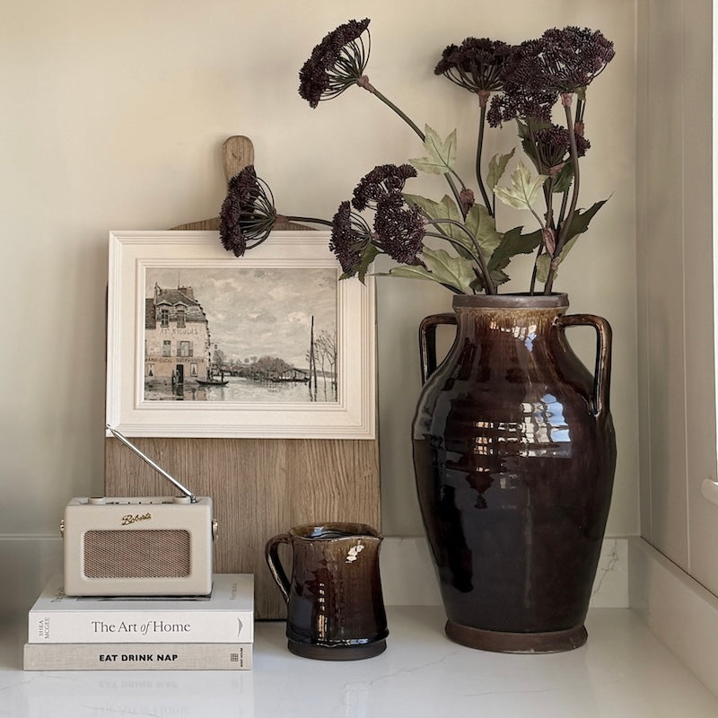A classic amphora silhouette with dual side handles perfect for displaying seasonal faux foliage.