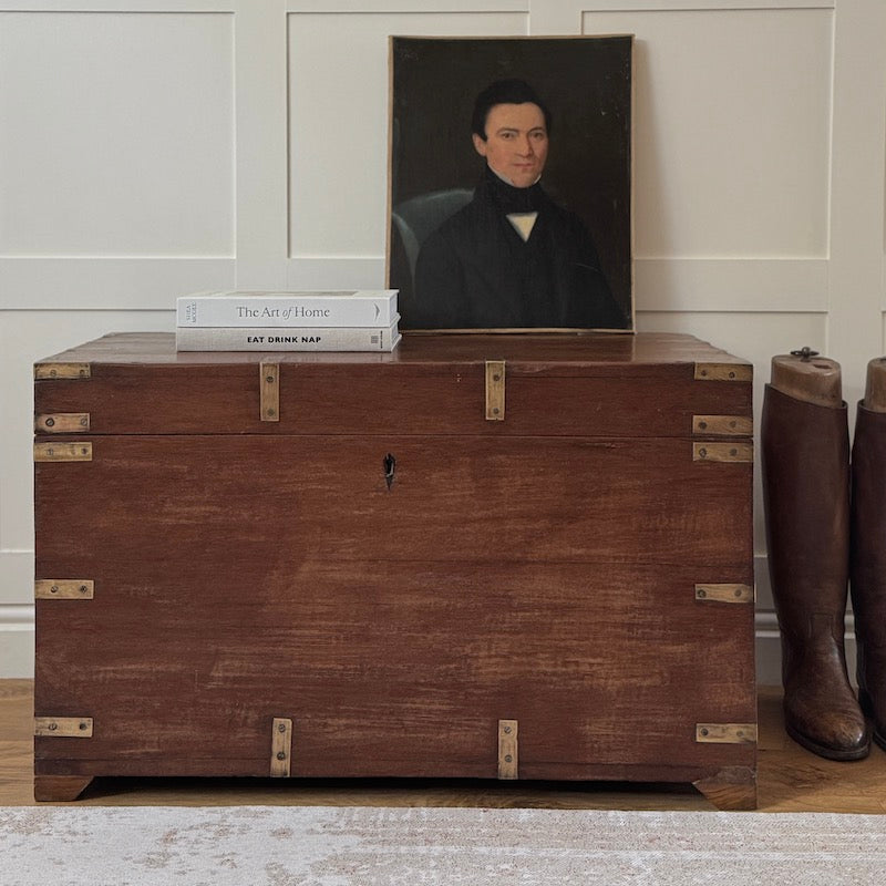 Designed in the traditional campaign style – made for travel and durability – this chest combines robust functionality with timeless character. Its rich teak grain and aged patina tell a story of heritage, while the brass detailing enhances its authentic military-inspired design.