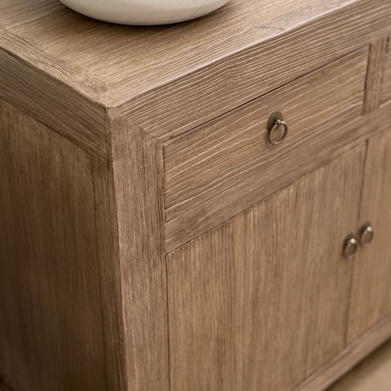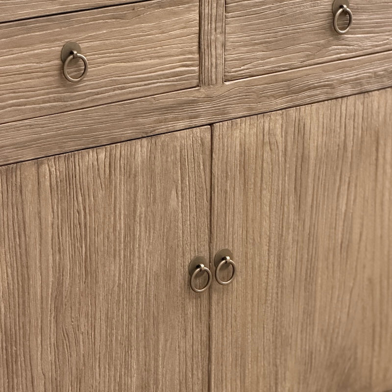 Our Reclaimed Elm 2 Door 2 Drawer Sideboard – a compact wooden storage cabinet ideal for hallways, dining rooms, living spaces and bedrooms. Ideal as a hallway console, small sideboard, linen cupboard or living room storage piece.