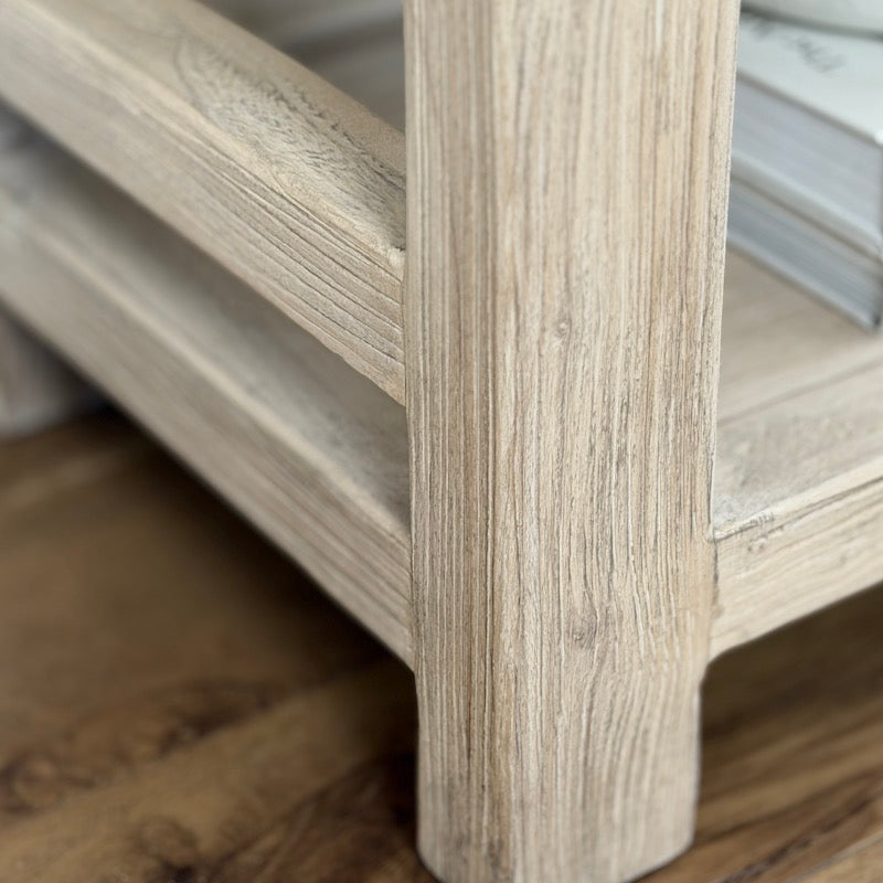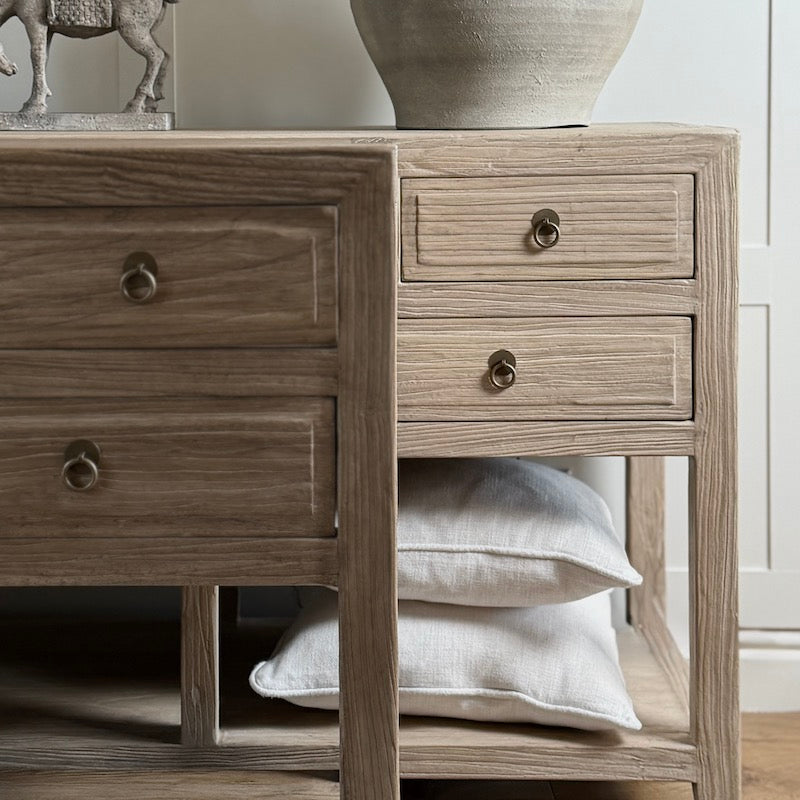 With three drawers, a bottom shelf and a solid back, this unique elm console is outstanding. Finished in a light tone and with superb graining to the top.