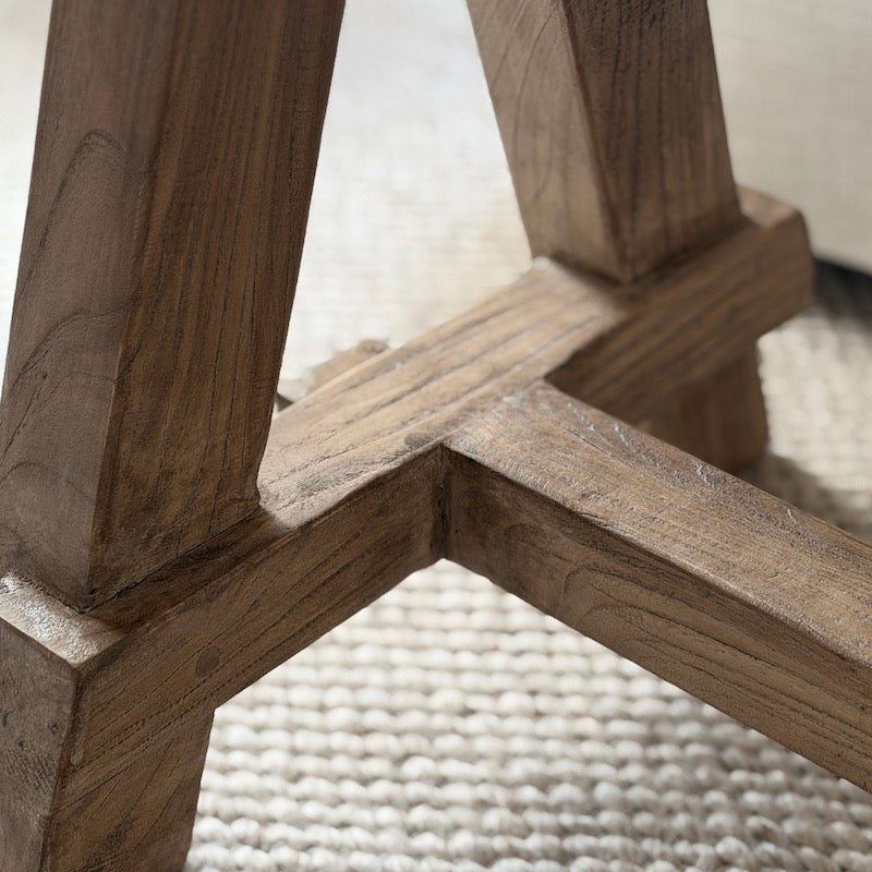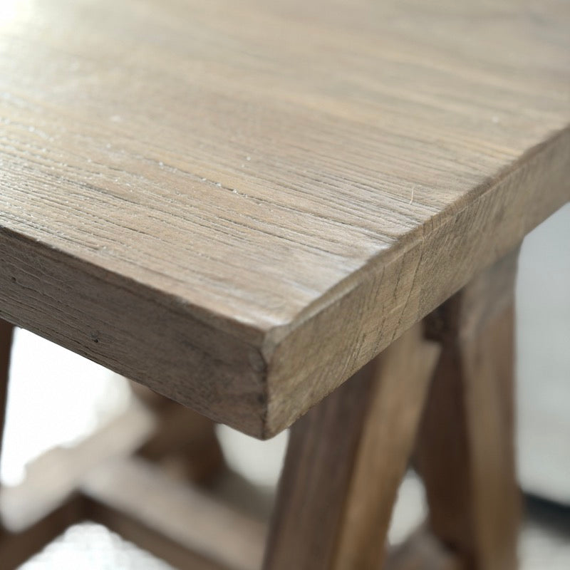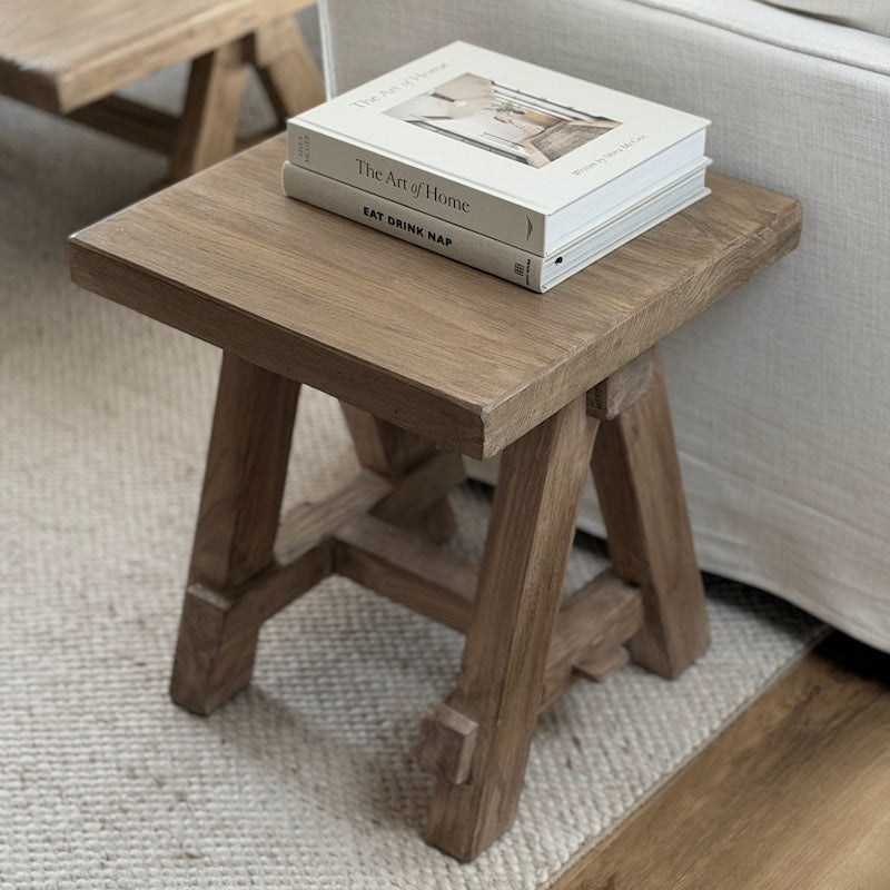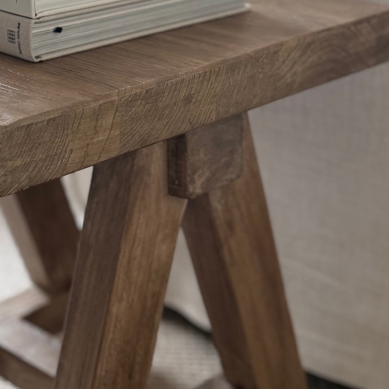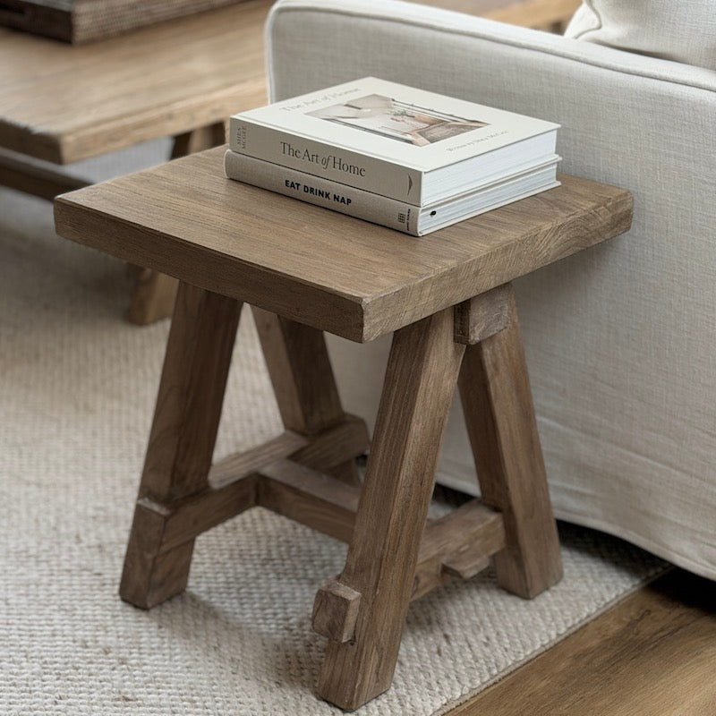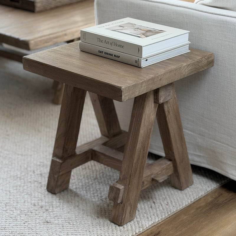 A solid, compact side table crafted from reclaimed elm, finished in a rich tone that showcases the natural grain and texture of the wood. The A-frame base gives it a sturdy, rustic feel, ideal beside a sofa or armchair. Heavy side table.