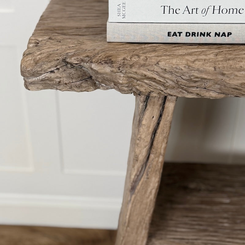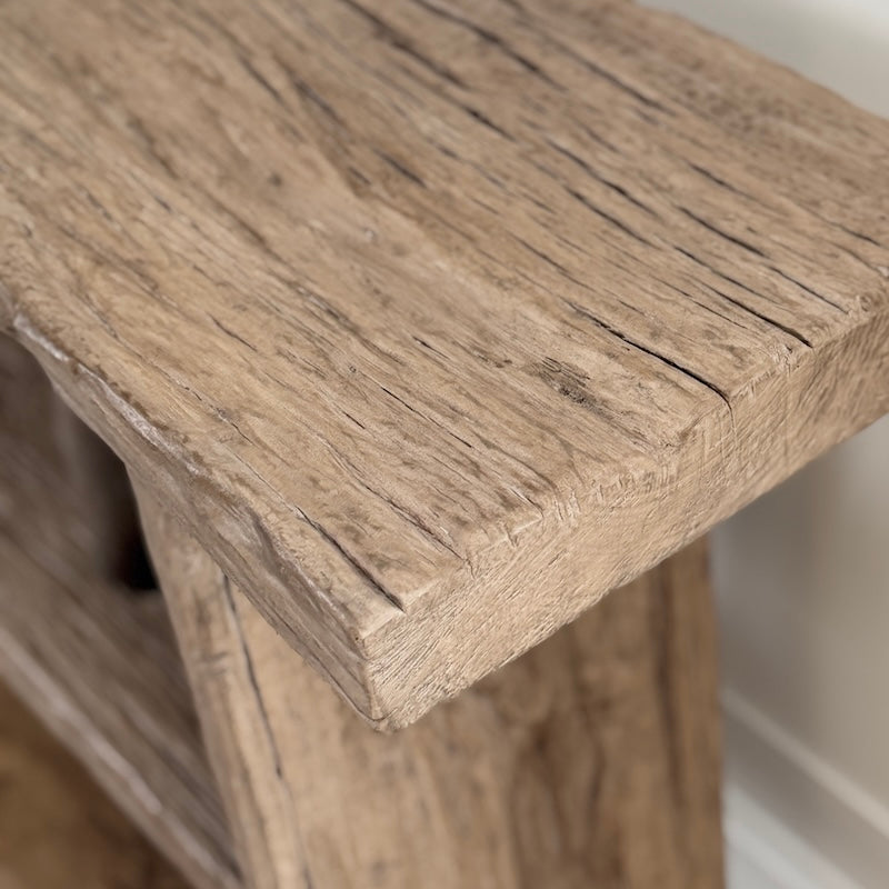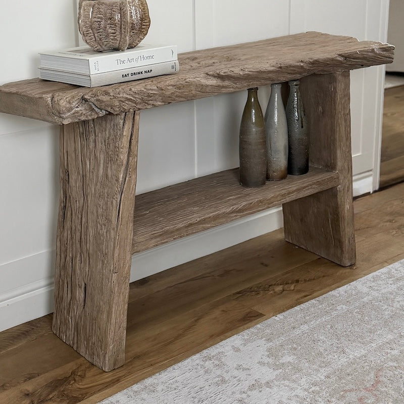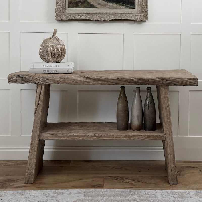 Our reclaimed elm 2 shelf console tables are stunning. The age, history and imagination of where and how this wood has been used before reclamation could take you on a journey way back in time and to extraordinary lands.