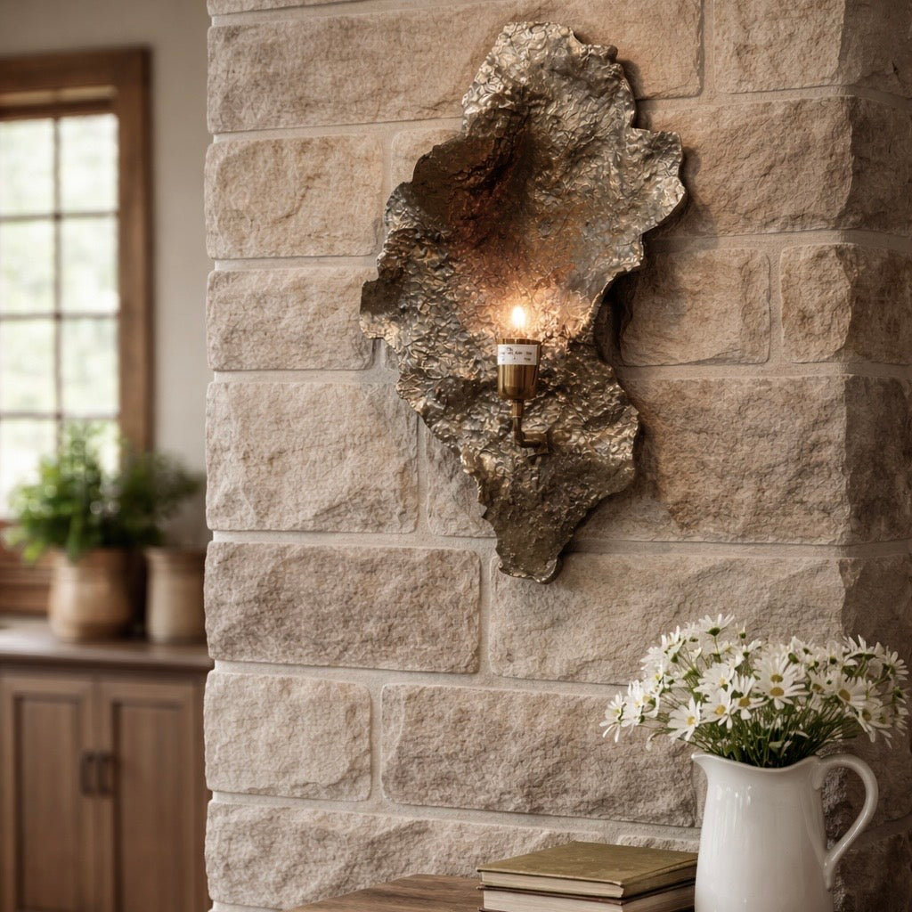 Designed to be mounted directly to the wall, the irregular form catches and reflects light beautifully, creating soft highlights and shadows across stone, plaster or timber surfaces. The exposed bulb sits within a subtle metal holder, allowing a warm glow to radiate while showcasing the raw, artisanal nature of the piece.