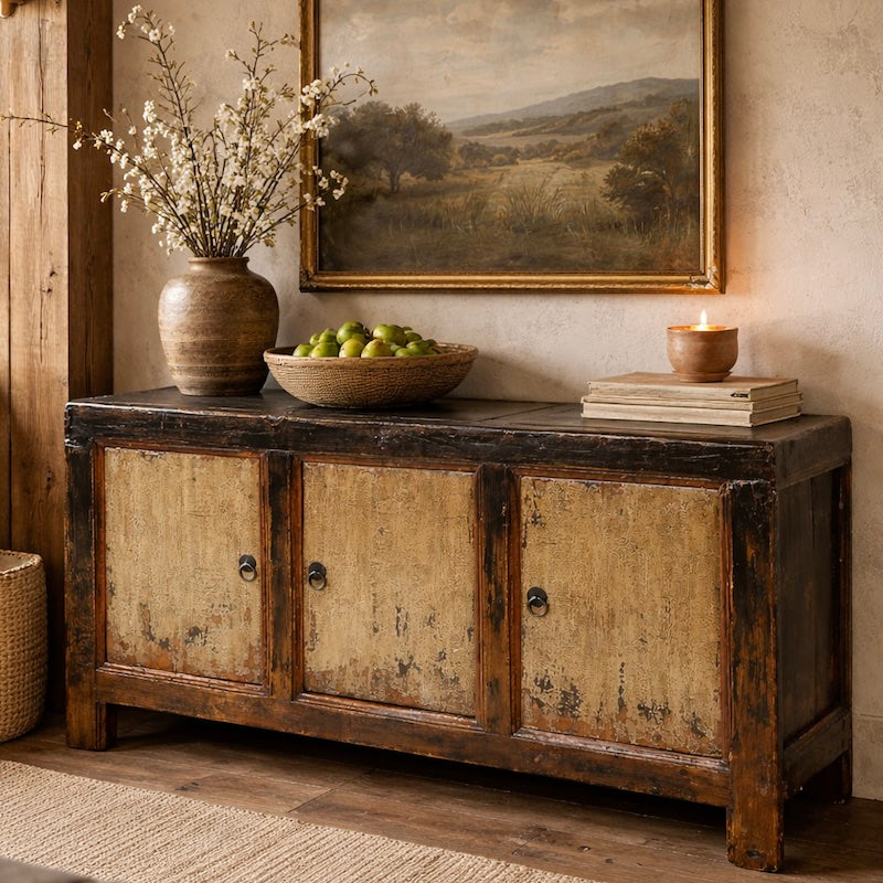 Robustly constructed and beautifully proportioned, the piece offers generous internal storage behind three panelled doors, making it as practical as it is decorative. The darker lacquered frame contrasts elegantly with the lighter, timeworn door fronts, giving the sideboard a depth and presence that works effortlessly in both classic and eclectic interiors.