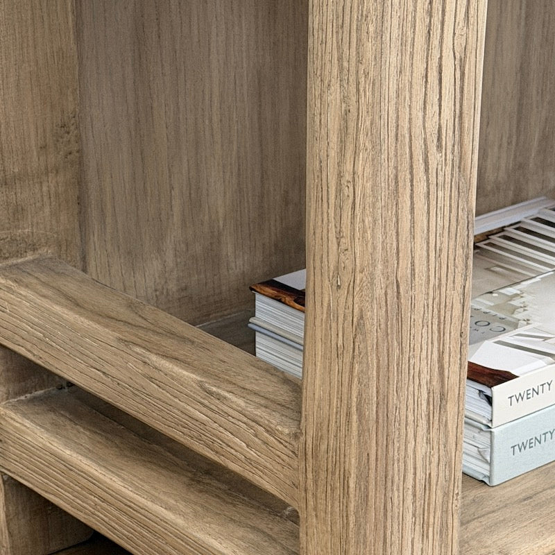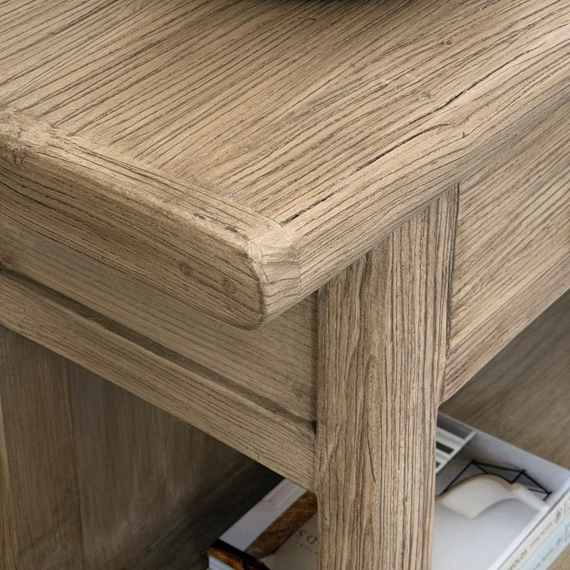 With three drawers, a bottom shelf and a solid back, this unique elm console is outstanding. Finished in a light tone and with superb graining to the top.